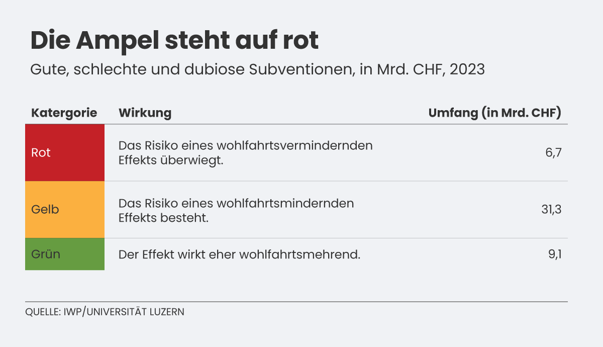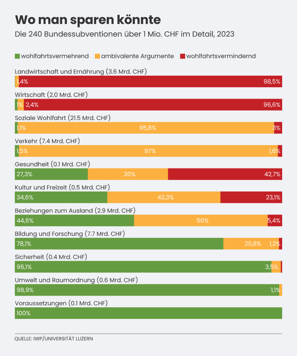 Gemäss dem Institut für Schweizer Wirtschaftspolitik an der Universität Luzern (IWP) schüttet der Bund jedes Jahr Subventionen von rund 48,5 Milliarden Franken aus (2023). Davon sind 38 Milliarden «aus wohlfahrtstheoretischer Sicht fragwürdig bis überflüssig», urteilt das IWP, das heisst: sie generieren «mehr Schaden als Nutzen».