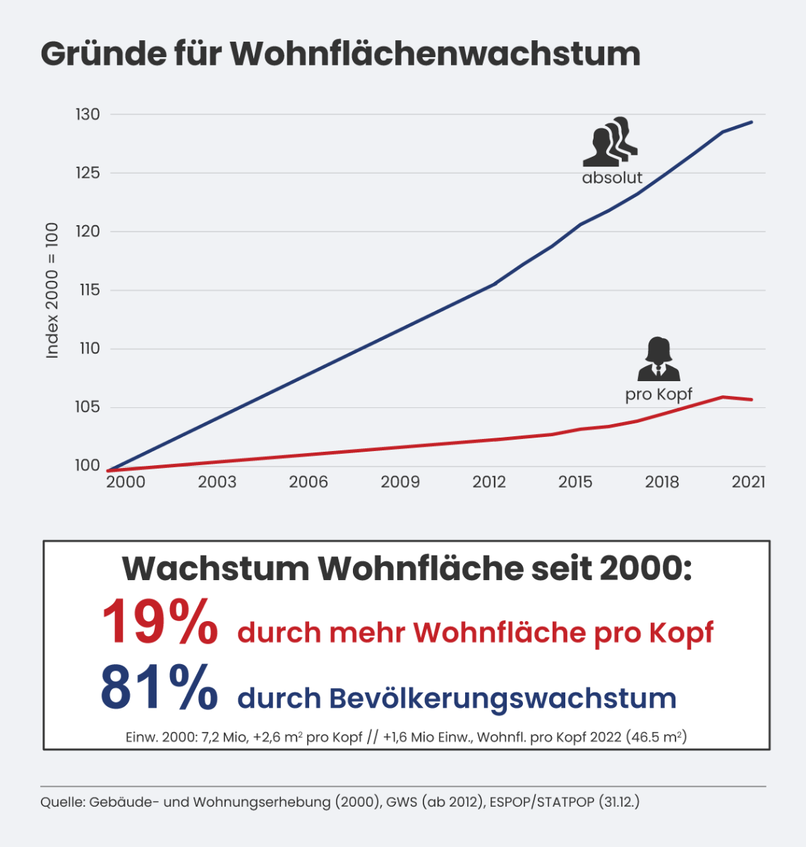 Dagegen gaben sich die Schweizer (besser: die Inländer) ab dem Jahr 2000 eher bescheidener. Sie leisteten sich zwar etwas mehr Quadratmeter, doch das Wachstum flachte sich deutlich ab.
