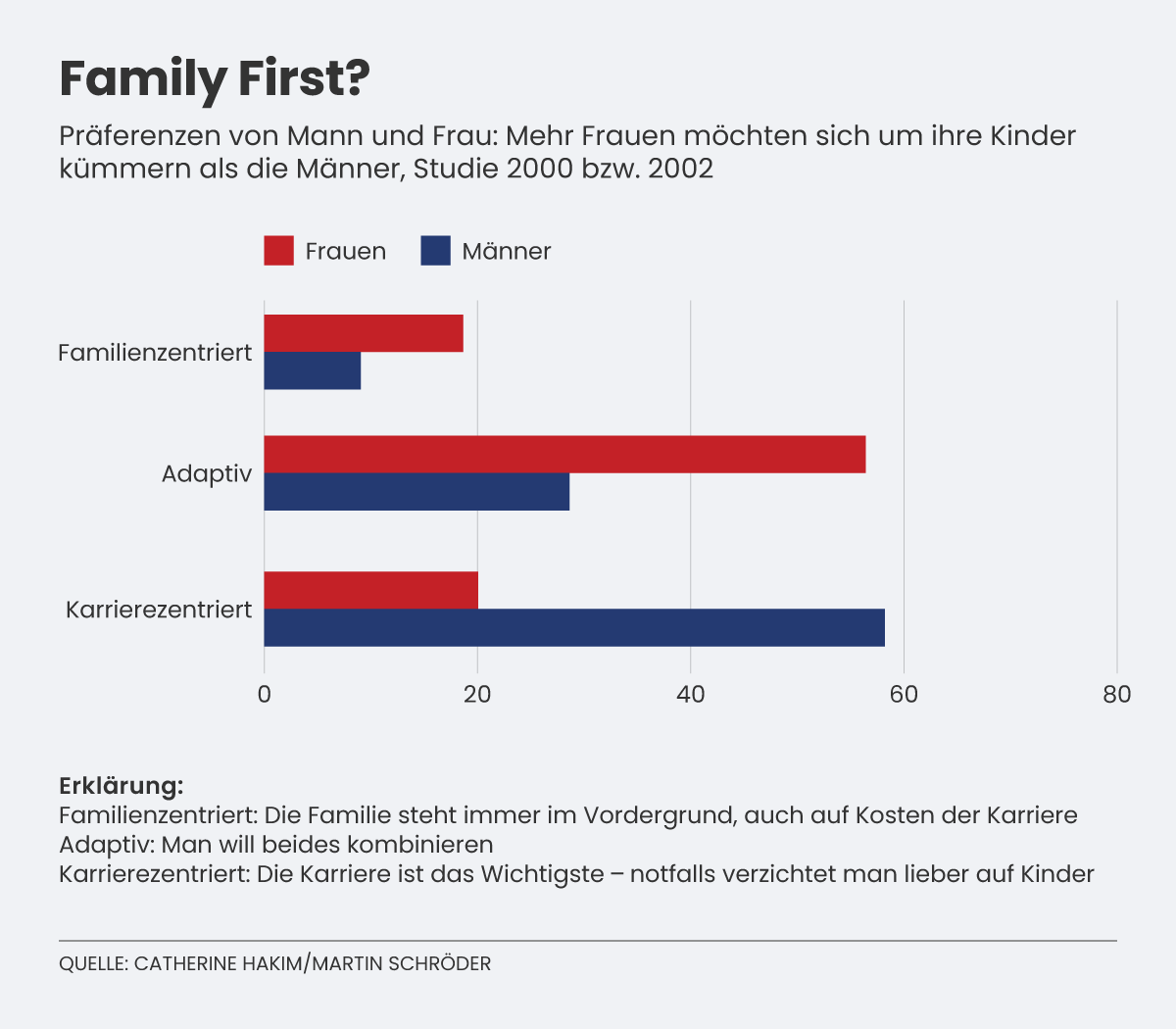 Tatsächlich kommt eine Studie der britischen Soziologin Catherine Hakim zu genau diesem Schluss. Dabei stützt sie sich auf eine repräsentative Umfrage, wo Männer und Frauen ihre Vorlieben angeben, was Arbeit und Familie anbelangt.